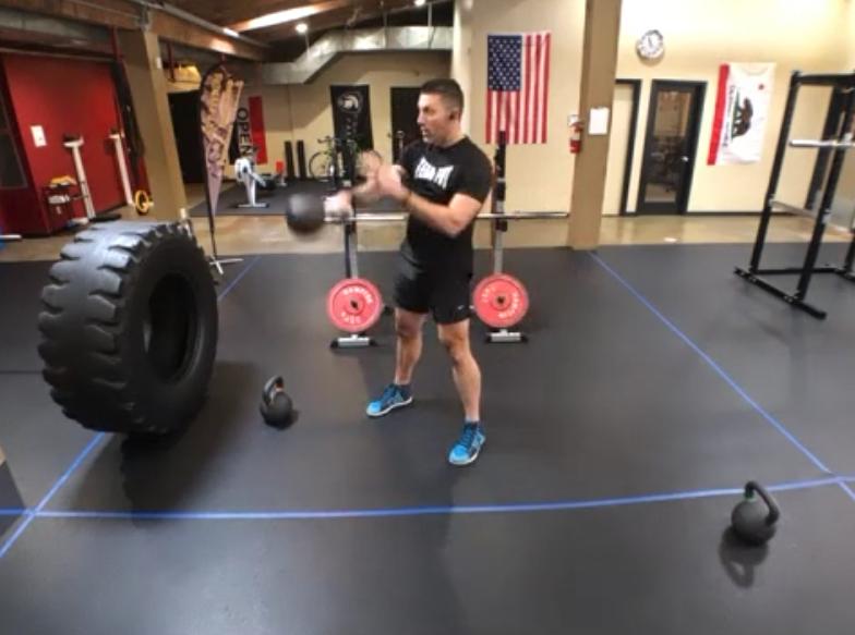 Step back from the bell so it’s slightly in front of your feet. Hike it back like a football snap, then drive your hips through. That’s the focus — the hip snap. Let the bell float up (maybe waist height), but don’t worry about how high it goes. This is not an arm lift. Just hips.
