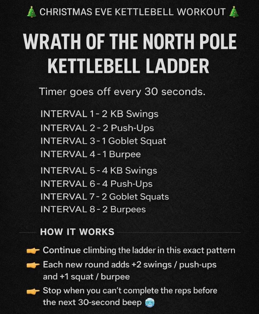 -> Continue climbing the ladder in this exact pattern -> Each new round adds +2 swings / push-ups and +1 squat / burpee -> Stop when you can’t complete the reps before the next 30-second beep 🥶